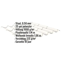 Gemaakt van Staal met een materiaaldikte van 0,50 mm, biedt het een robuuste dakoplossing. De plaatbreedte van 1,14 m en de effectieve werkende breedte van 1,06 m maken een snelle en efficiënte montage mogelijk. Dankzij de 25 µm polyester coating in Zuiverwit (RAL 9010) blijft het materiaal permanent beschermd tegen corrosie, terwijl de profielhoogte van 47 mm extra stabiliteit biedt. De geïntegreerde anti-capillaire groef voorkomt het binnendringen van vocht bij de overlappingen en zorgt voor een optimale waterafvoer.