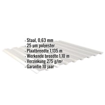 Gemaakt van Staal met een materiaaldikte van 0,63 mm, biedt het een robuuste wandoplossing. De plaatbreedte van 1,135 m en de effectieve werkende breedte van 1,10 m maken een snelle en efficiënte montage mogelijk. Dankzij de 25 µm polyester coating in Zilver-Metallic (RAL 9006) blijft het materiaal permanent beschermd tegen corrosie, terwijl de profielhoogte van 20 mm extra stabiliteit biedt. De geïntegreerde anti-capillaire groef voorkomt het binnendringen van vocht bij de overlappingen en zorgt voor een optimale waterafvoer.