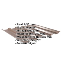Gemaakt van Staal met een materiaaldikte van 0,50 mm, biedt het een robuuste dakoplossing. De plaatbreedte van 1,07 m en de effectieve werkende breedte van 1,035 m maken een snelle en efficiënte montage mogelijk. Dankzij de 25 µm polyester coating in Antracietgrijs (RAL 7016) blijft het materiaal permanent beschermd tegen corrosie, terwijl de profielhoogte van 35 mm extra stabiliteit biedt. De geïntegreerde anti-capillaire groef voorkomt het binnendringen van vocht bij de overlappingen en zorgt voor een optimale waterafvoer.