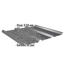 Gemaakt van Staal met een materiaaldikte van 0,50 mm, biedt het een robuuste dakoplossing. De plaatbreedte van 1,069 m en de effectieve werkende breedte van 1,00 m maken een snelle en efficiënte montage mogelijk. Dankzij de 60 µm Puramid coating in Antracietgrijs (RAL 7016) blijft het materiaal permanent beschermd tegen corrosie, terwijl de profielhoogte van 45 mm extra stabiliteit biedt. De geïntegreerde anti-capillaire groef voorkomt het binnendringen van vocht bij de overlappingen en zorgt voor een optimale waterafvoer.