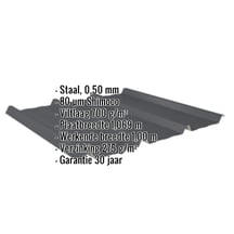Gemaakt van Staal met een materiaaldikte van 0,50 mm, biedt het een robuuste dakoplossing. De plaatbreedte van 1,069 m en de effectieve werkende breedte van 1,00 m maken een snelle en efficiënte montage mogelijk. Dankzij de 80 µm Shimoco coating in Antracietgrijs (RAL 7016) blijft het materiaal permanent beschermd tegen corrosie, terwijl de profielhoogte van 45 mm extra stabiliteit biedt. De geïntegreerde anti-capillaire groef voorkomt het binnendringen van vocht bij de overlappingen en zorgt voor een optimale waterafvoer.