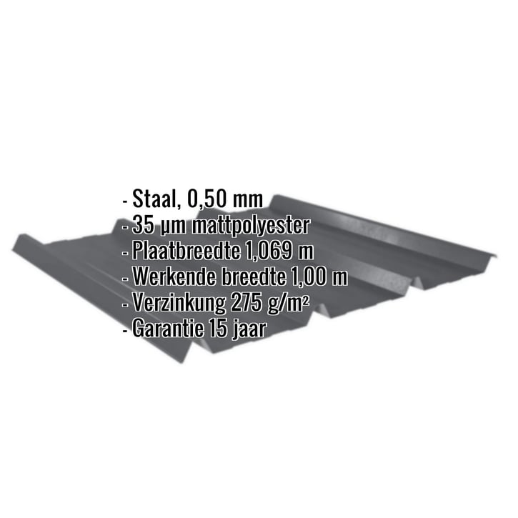 Gemaakt van Staal met een materiaaldikte van 0,50 mm, biedt het een robuuste dakoplossing. De plaatbreedte van 1,069 m en de effectieve werkende breedte van 1,00 m maken een snelle en efficiënte montage mogelijk. Dankzij de 35 µm mattpolyester coating in Donkergrijs (≈ RAL 7024) blijft het materiaal permanent beschermd tegen corrosie, terwijl de profielhoogte van 45 mm extra stabiliteit biedt. De geïntegreerde anti-capillaire groef voorkomt het binnendringen van vocht bij de overlappingen en zorgt voor een optimale waterafvoer.