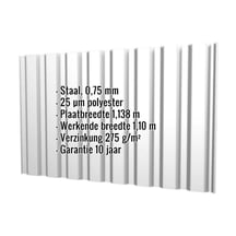 Gemaakt van Staal met een materiaaldikte van 0,75 mm, biedt het een robuuste wandoplossing. De plaatbreedte van 1,138 m en de effectieve werkende breedte van 1,10 m maken een snelle en efficiënte montage mogelijk. Dankzij de 25 µm polyester coating in Lichtgrijs (RAL 7035) blijft het materiaal permanent beschermd tegen corrosie, terwijl de profielhoogte van 18 mm extra stabiliteit biedt. De geïntegreerde anti-capillaire groef voorkomt het binnendringen van vocht bij de overlappingen en zorgt voor een optimale waterafvoer.
