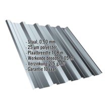 Gemaakt van Staal met een materiaaldikte van 0,50 mm, biedt het een robuuste dakoplossing. De plaatbreedte van 1,08 m en de effectieve werkende breedte van 1,05 m maken een snelle en efficiënte montage mogelijk. Dankzij de 25 µm polyester coating in Pelsgrijs (RAL 7000) blijft het materiaal permanent beschermd tegen corrosie, terwijl de profielhoogte van 35 mm extra stabiliteit biedt. De geïntegreerde anti-capillaire groef voorkomt het binnendringen van vocht bij de overlappingen en zorgt voor een optimale waterafvoer.