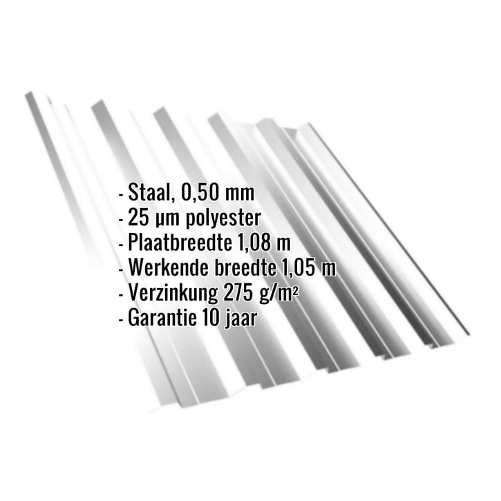 Gemaakt van Staal met een materiaaldikte van 0,50 mm, biedt het een robuuste dakoplossing. De plaatbreedte van 1,08 m en de effectieve werkende breedte van 1,05 m maken een snelle en efficiënte montage mogelijk. Dankzij de 25 µm polyester coating in Lichtgrijs (RAL 7035) blijft het materiaal permanent beschermd tegen corrosie, terwijl de profielhoogte van 35 mm extra stabiliteit biedt. De geïntegreerde anti-capillaire groef voorkomt het binnendringen van vocht bij de overlappingen en zorgt voor een optimale waterafvoer.