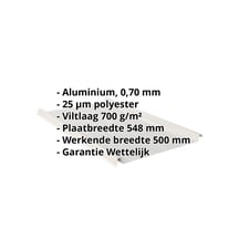 Gemaakt van Aluminium met een materiaaldikte van 0,70 mm, biedt het een robuuste dakoplossing. De plaatbreedte van 54,8 cm en de effectieve werkende breedte van 50 cm maken een snelle en efficiënte montage mogelijk. Dankzij de 25 µm polyester coating in Zilver-Metallic (RAL 9006) blijft het materiaal permanent beschermd tegen corrosie, terwijl de profielhoogte van 33 mm extra stabiliteit biedt. De geïntegreerde anti-capillaire groef voorkomt het binnendringen van vocht bij de overlappingen en zorgt voor een optimale waterafvoer.